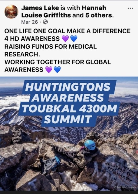 HDSA WA Chapter has three people doing a fundraising climb to Toubkal Summit in Morocco on May 1st. Won't you support them by donating to help people suffering from Huntington's Disease - 💙💜